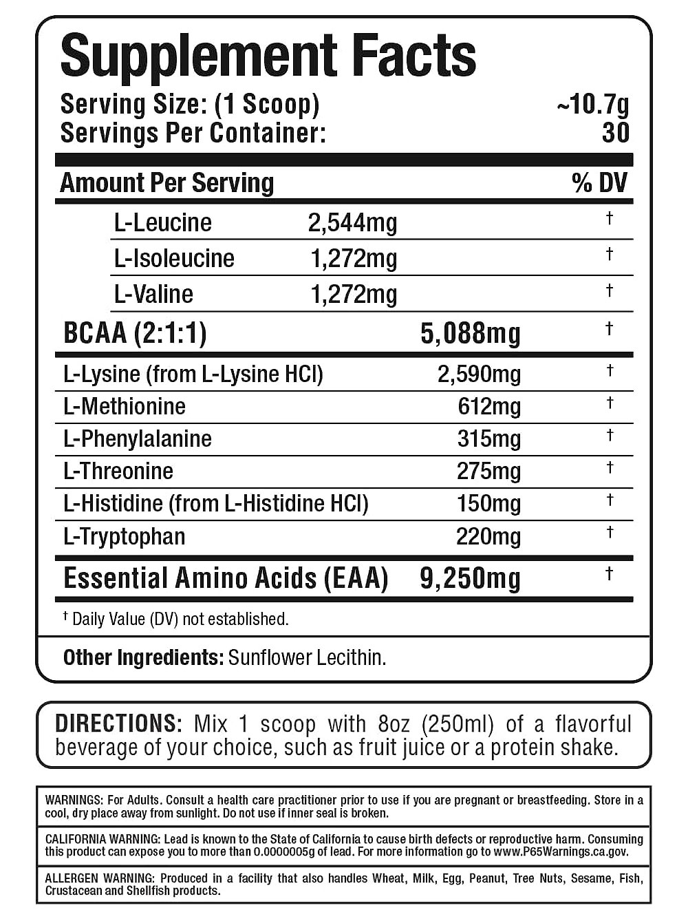 - HELP BUILD MORE MUSCLE - ALLMAX Essentials EAA delivers 9.25 g of all nine essential amino acids (EAAs). It also includes 5g of branched-chain amino acids (BCAAs) in a 2:1:1 ratio, which is clinically shown to support muscle growth and recovery.
