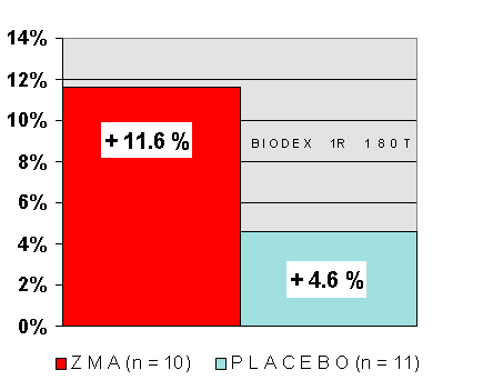 In addition to measuring the anabolic hormone increases in the football players, Dr. Brilla measured their muscle strength and functional power increases. The players who took ZMA nightly during the 8-week period of intensive training had 2.5 times greater strength gains than the placebo group. (1,2) According to Dr. Brilla, "This study shows that anabolic hormone and muscle strength increases can be induced in already strength-trained athletes by using a novel zinc-magnesium preparation". This is the exact formula used in ZMA 2000.