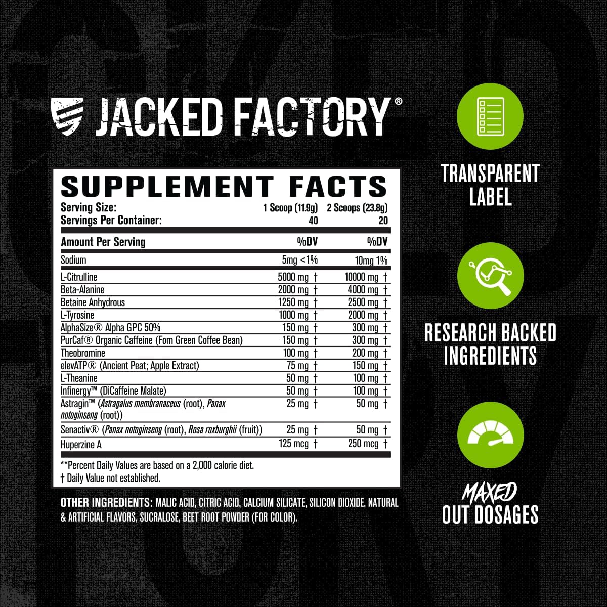Jacked Factory Nitrosurge Max - Hard-hitting formula that's stepping up it's game comes fully loaded with premium ingredients in MAX'ed out dosages of L-Citrulline, Beta Alanine, PurCaf®, L-Tyrosine, and many more so you can step up yours.