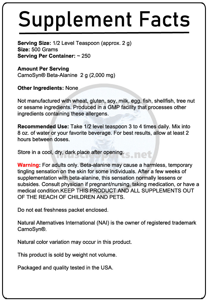 Beta-alanine is a non-essential amino acid that is used by muscle cells to synthesize carnosine. Carnosine is a dipeptide (beta-alanine plus histidine) that functions as a buffer for the hydrogen ions (acid) produced during strenuous exercise, thus helping to maintain optimum muscular pH. NOW Sports uses CarnoSyn®, a patented form of beta-alanine that has been clinically tested and shown to increase muscle carnosine content, allowing muscles to work harder and longer during intense exercise. NOW® Sports Beta-Alanine is backed by scientific research demonstrating that CarnoSyn® supplementation results in delayed muscle fatigue and rapid recovery time, thereby helping you attain your strength and endurance training goals.