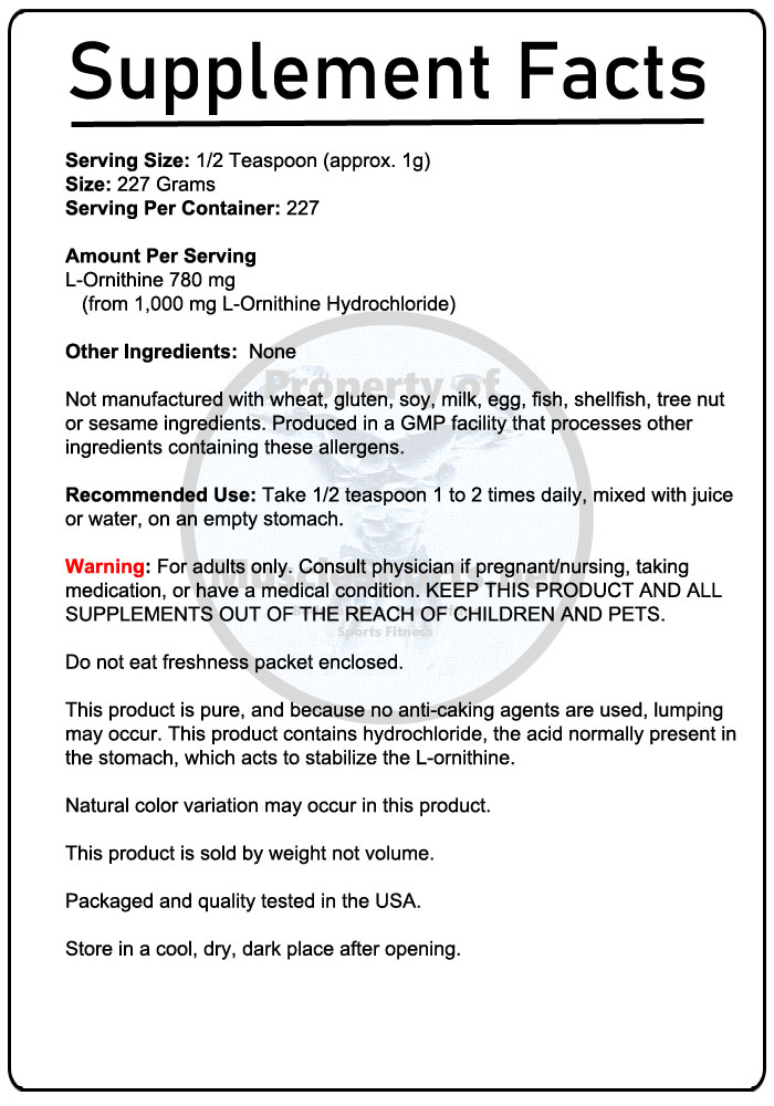 This product is pure, and because no anti-caking agents are used, lumping may occur. This product contains hydrochloride, the acid normally present in the stomach, which acts to stabilize the L-ornithine.