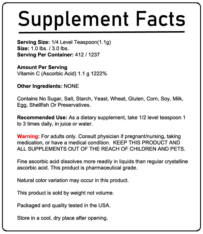 Ascorbic Acid is another name for Vitamin C. Vitamin C is a popular antioxidant and one of the most widely used vitamins in the world. Fine Ascorbic Acid is a bioavailable form of Vitamin C in a powder form, so it can be combined with other powdered supplements or dissolved in liquid for easy ingestion.