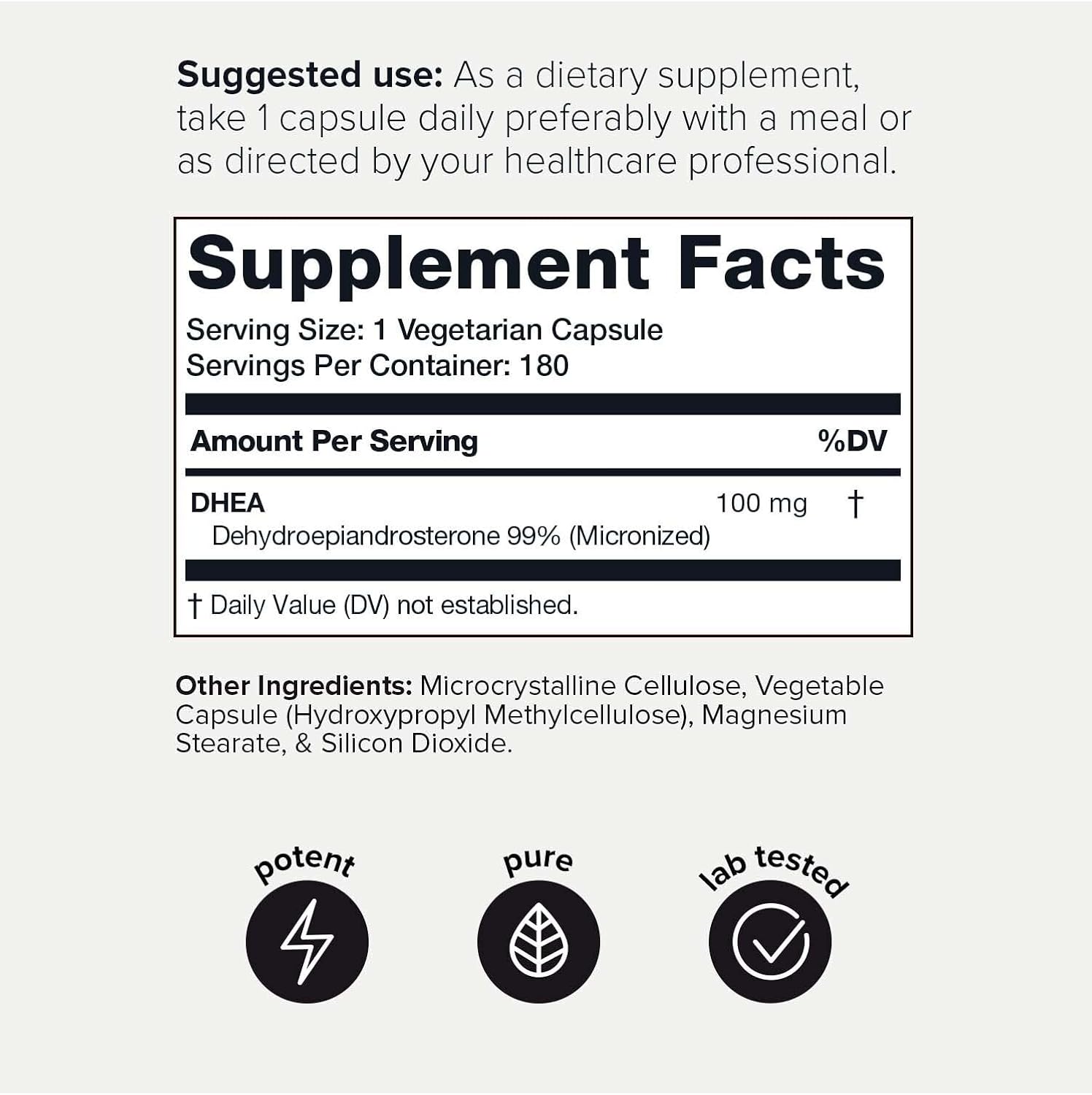 - The Highly Purified Form of DHEA - Toniiq DHEA 100mg brings one of the most highly potent levels of hormone balance support on the market. Our micronized DHEA formula contains an unprecedented purity level of 99%+ (most DHEA 50mg and DHEA 25mg products won't disclose their purity levels). Higher purity means more of the active compounds in each serving that give DHEA its powerful health properties.