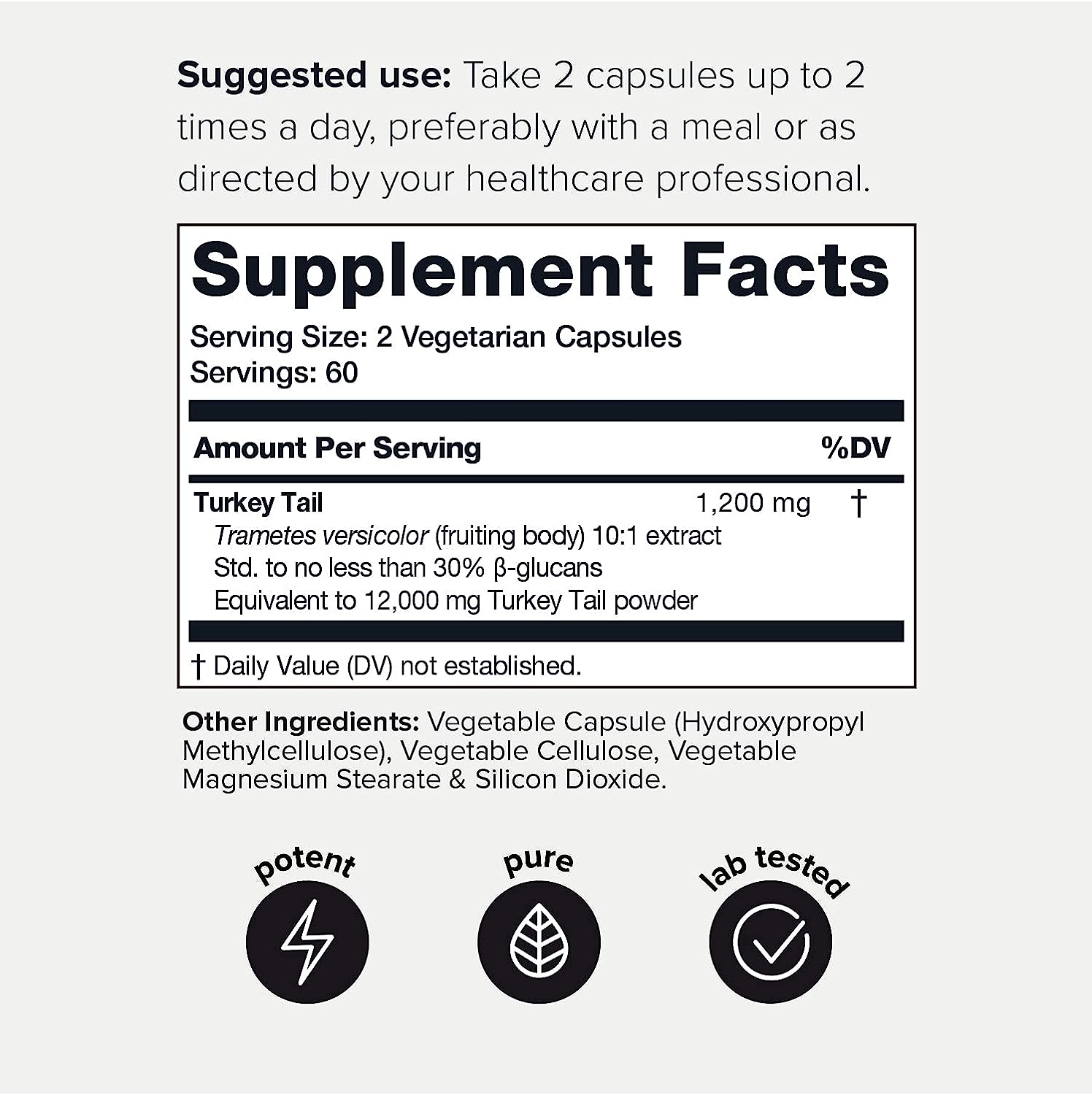 - Aqueous Extracted for Bioactive Availability - Toniiq Turkey Tail mushroom supplement contains 1200mg of some of the highest quality Turkey Tail mushroom powder – grown and cultivated using a patented extraction process to ensure a concentrated dose of 360mg beta glucans in each serving (other turkey tail extract products contain 150mg or less).
