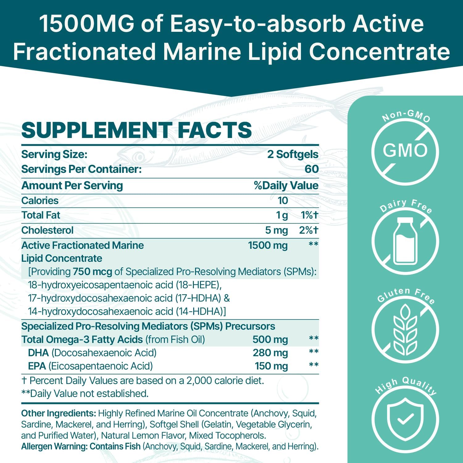- ADVANCED FORMULA: Our premium blend stands out with a potent composition featuring 750 micrograms of specific pro-resolving mediators sourced from three active fractionated marine lipid concentrates—18-HEPE, 17-HDHA, and 14-HDHA. Additionally, we've incorporated two essential SPM precursors, EPA and DHA, thereby achieving an overall improvement in the benefits of spm across various aspects.