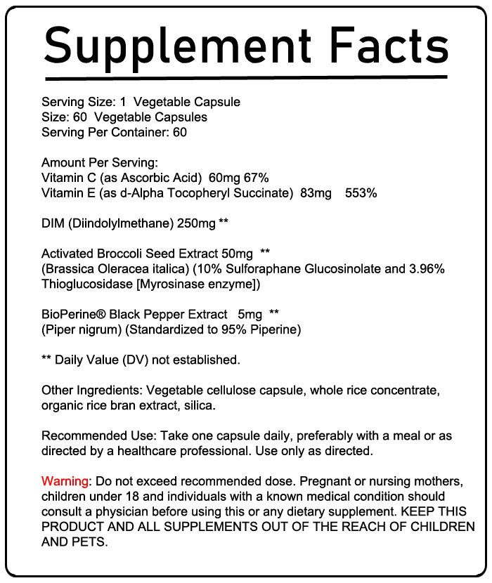 Sometimes when you’re on the go it’s tough to get all of your greens. But missing out on greens also means missing out on their nutritional benefits that support healthy aging, boosted vitality, and hormone balance in both men and women. Our advanced formula combines activated broccoli seed extract, which contains naturally-occuring diindolylmethane, with vitamin C, vitamin E, and BioPerine. What you get is a formula designed to provide you nutrients for that youthful energy you crave.